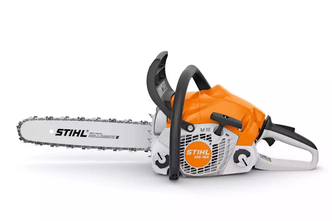 Die kraftvolle Benzin-Motorsäge STIHL MS 182 kommt vor allem beim Brennholzsägen, im Garten- und Landschaftsbau und in der Grundstückspflege optimal zum Einsatz. Dank des leistungsstarken Motors decken Sie sowohl privat wie auch als Profi im Garten- und Landschaftsbau und im Handwerk mit dieser Kettensäge ein sehr breites Aufgabenspektrum ab. Selbst das Fällen kleiner Bäume ist mit der MS 182 möglich. Der leistungsstarke STIHL 2-MIX-Motor der MS 182 bewirkt nicht nur eine sehr gute Schnittleistung, sondern ist dabei auch sparsam. Das STIHL Antivibrationssystem unterstützt ein komfortables Arbeiten mit der Kettensäge, denn es schont Ihre Muskeln und Gelenke. Zudem steuern Sie mit der Einhebelbedienung alle Funktionen der Benzin-Motorsäge mit nur einer Hand. Ihre Arbeit wird zusätzlich durch den stabilen Krallenanschlag erleichtert. Er hilft Ihnen, die Säge fest am Holz anzusetzen und so einen präzisen Schnitt auszuführen. Das robuste Filterelement aus Vliesmaterial sorgt für lange Wartungsintervalle. Für Arbeiten im Schnee sind spezielle Polyamid-Filter erhältlich. Ein weiteres praktisches Merkmal der STIHL MS 182: Nach Arbeitsunterbrechungen ist der Motor sofort wieder startklar, denn der Kombihebel mit Stopp-Funktion springt selbständig in die Betriebsposition zurück. Die seitliche Kettenspannung erleichtert das Nachspannen der Kette und fördert damit ein möglichst unterbrechungsarmes Arbeiten.