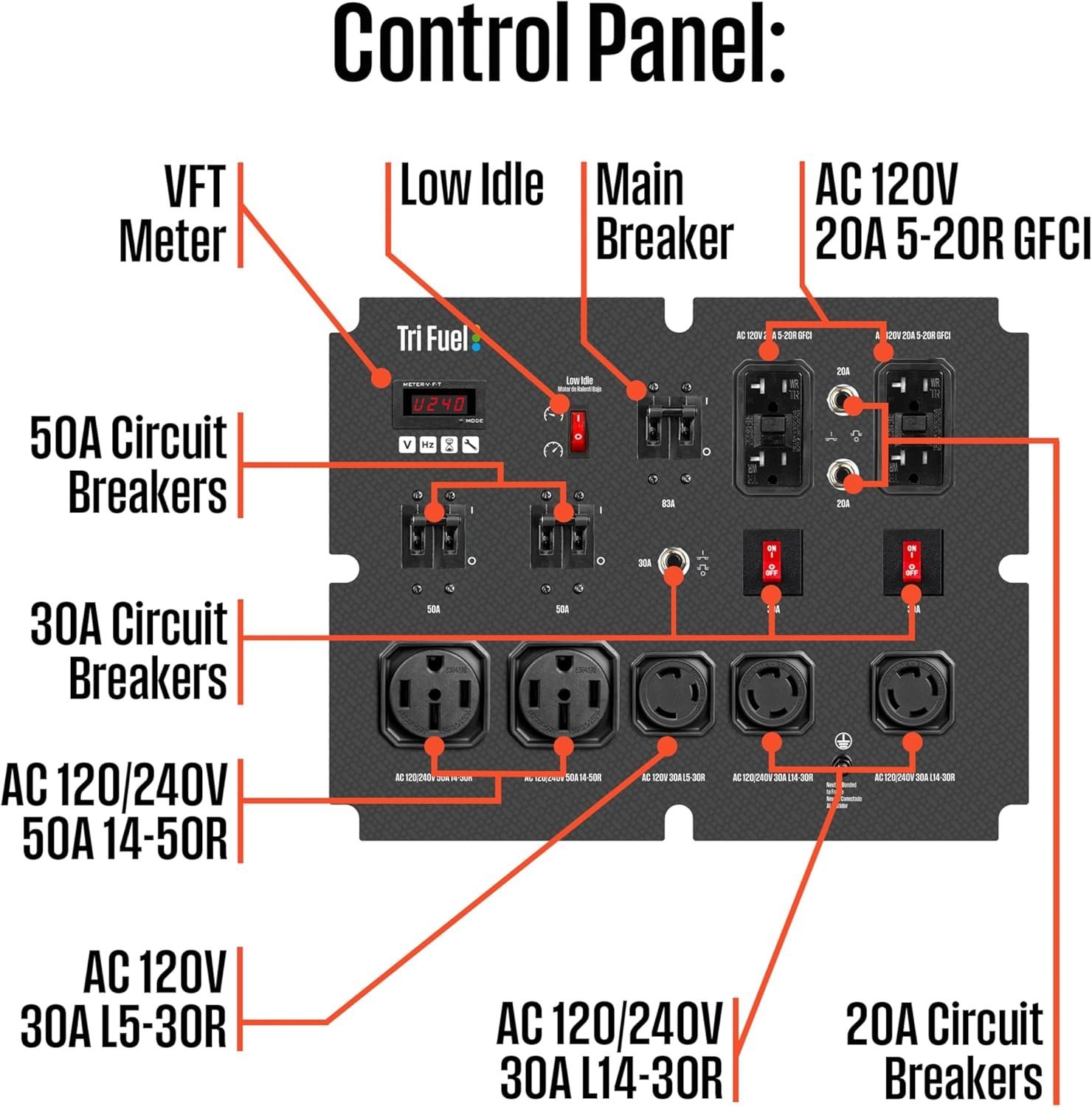 Der Westinghouse WGen20000TFc Tri-Fuel tragbare Generator mit CO-Sensor erzeugt bis zu 28.000 Startwatts und 20.000 Dauerwatts und läuft mit Benzin, Propan oder Erdgas. Der schwere 999 cc 4-Takt OHV Westinghouse V-Twin Motor hat eine Gusseisen-Ausführung und läuft bis zu 13 Stunden bei 25% Last mit einem 17,2-Gallonen Benzintank, versorgt Sie Tag und Nacht mit Strom und verfügt über eine eingebaute Kraftstoffanzeige, automatische Abschaltung bei niedrigem Ölstand und GFCI-Steckdosen. Druckknopf-Elektrostart und eine Fernstart-Fernbedienung machen das Starten einfach. Bei weniger als 5% THD können Sie sicher Elektronik wie Computer, Telefone und Fernseher betreiben. Kupferwicklungen helfen der Einheit, saubereren Strom zu erzeugen, kühler zu laufen und länger zu halten. Es gibt zwei 14-50R 50A Anschlüsse und zwei L14-30R 30A Anschlüsse. Alle sind „Transfer-Switch“ und „Interlock-Kit“ ready, sodass sie große Geräte wie Klimaanlagen, Kühlschränke, Sumpfpumpen sowie Lichter und Unterhaltungselektronik gleichzeitig mit einem einzigen Kabelanschluss mit Strom versorgen können. Er hat auch einen 120V L5-30R 30A Anschluss. Unser exklusiver 125A 240V AC Klemmblock ermöglicht es einem lizenzierten Elektriker, den Generator direkt an Ihr Haus anzuschließen, um volle Leistung zu liefern. Ein VFT-Datencenter zeigt Spannungsausgang, Frequenz und Lebensstunden für Echtzeit-Informationen und Wartungsalarme an. Einfach transportierbar mit plattenfesten Rädern, Griffen und Haltegriff, versorgt er Ihr Haus, Reisemobil oder Ihre Baustelle in Sekundenschnelle mit Strom.
