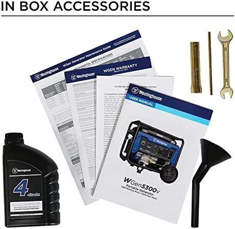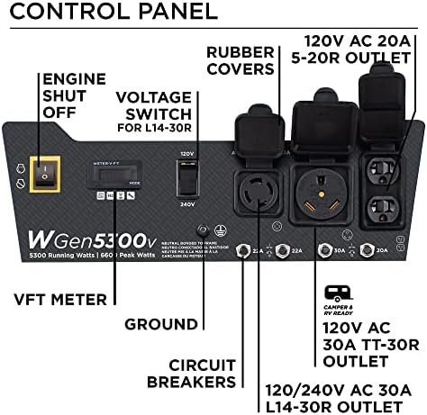 5300 Dauerwatts und 6600 Startwatts; Rückstart; 4,7 Gallonen Kraftstofftank mit Kraftstoffanzeige; Bis zu 14,5 Stunden Laufzeit pro Tank mit 120/240V Volt Wahlschalter. Enthält eine 5–20R 120V 20A Haushalts-Doppelsteckdose, eine wohnmobil-taugliche TT-30R 30A Steckdose und eine „Transfer Switch Ready“ L14-30R 30A Steckdose; Alle Anschlüsse haben Gummischutzkappen für zusätzliche Sicherheit. Plug-and-Play: Wird mit Öl, einem Öltrichter, einem Werkzeugsatz und einem Benutzerhandbuch geliefert, um Sie sofort startklar zu machen (minimale Montage erforderlich). Angetrieben von einem 274cc Westinghouse 4-Takt OHV Motor mit einer langlebigen Gusseisen-Ausführung und automatischer Abschaltung bei niedrigem Ölstand.