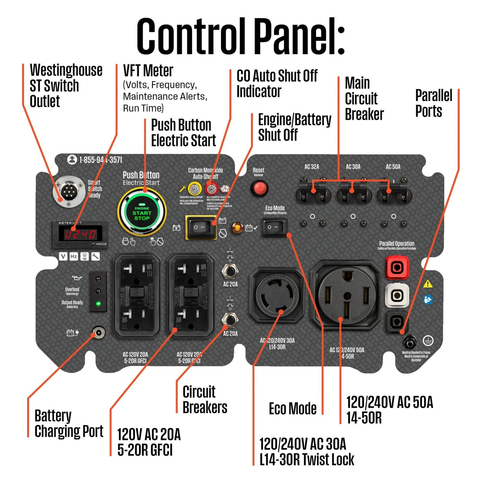 Perfekt als Notstromquelle für größere Haushalte oder eine zuverlässige Quelle für tragbaren Strom. 10.000 Startwatts, 7.600 Dauerwatts. Läuft bis zu 12 Stunden mit einem 5,28 Gallonen Kraftstofftank mit eingebauter Kraftstoffanzeige. Angetrieben von einem schweren 420cc 4-Takt OHV Westinghouse Motor mit einer langlebigen Gusseisen-Ausführung. Druckknopf-Elektrostart paart sich mit einer Fernbedienung für die Zündung aus der Entfernung und wird durch einen Notfall-Rückstart unterstützt. Wiegt 147,7 lbs. mit einem Betriebsgeräusch von nur 79 dBA. 4x GFCI 5-20R 20A Haushaltssteckdosen, 1x „Transfer Switch Ready“ L14-30R 120/240V Twist-Lock Steckdose und 1x 120/240V 14-50R mit Gummisteckdosenabdeckungen. VFT-Display gibt Ihnen Echtzeit-Updates mit der Spannungsausgabe, Frequenz und Lebensstunden. EPA-konform. Ausgestattet mit einem Kohlenmonoxid (CO)-Sensor mit automatischer Abschaltung.